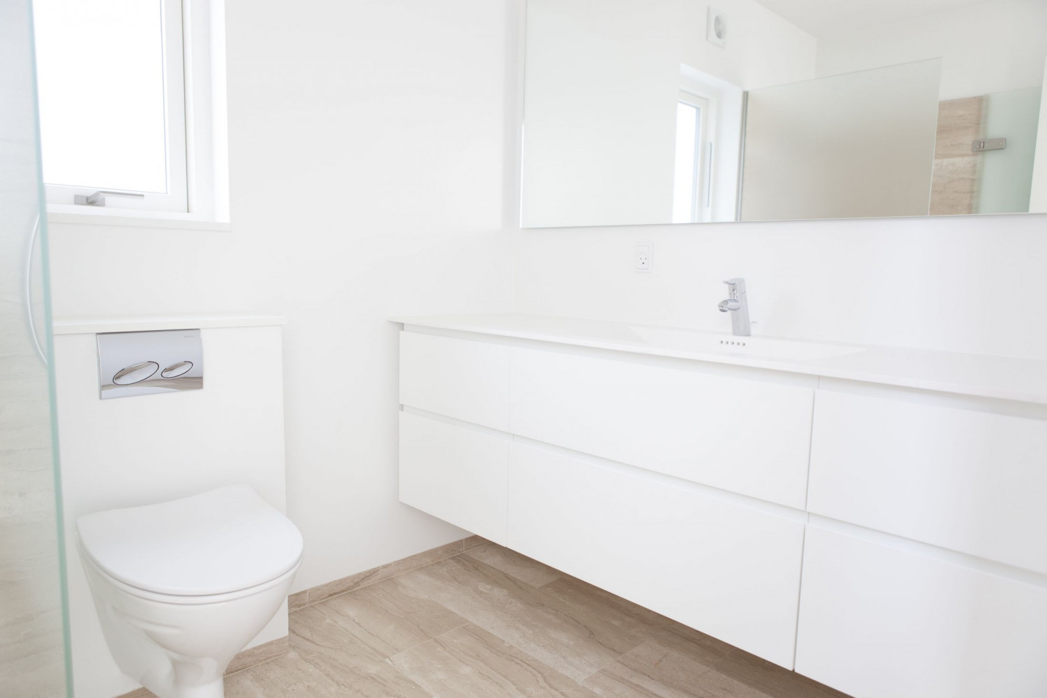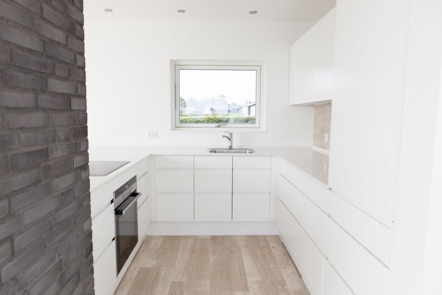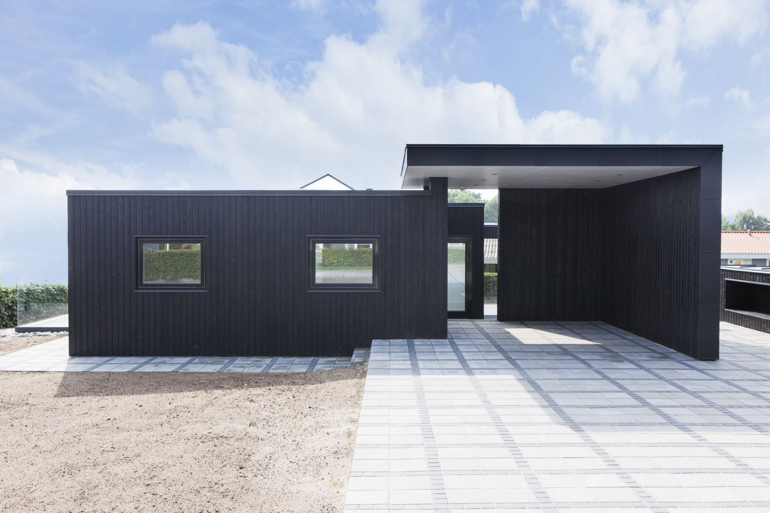 Sommerhuset er bygget med fladt tag, og der er valgt sorte og hvide materialer, som giver fritidshuset et moderne look.